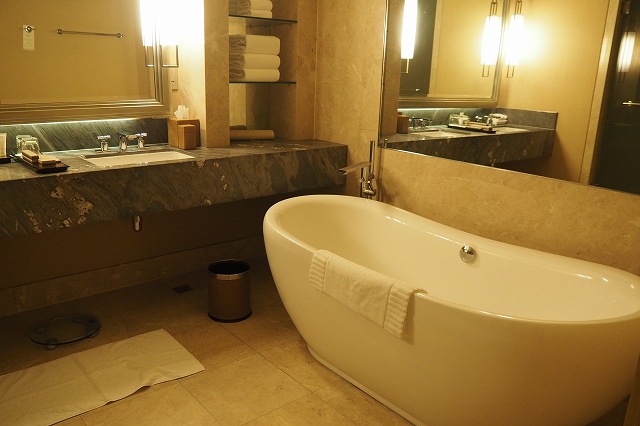 洗面台は2つ、据え置き型のバスタブがおしゃれです